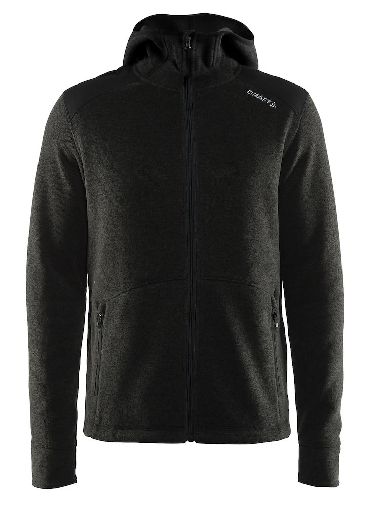 Ribbestrikket fleecejakke med hette, børstet innside og forsterkning på skuldrene og albuene. Lommer i siden med glidelås.